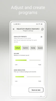 The Remote Control enables you to easily make changes to your hearing aid(s) to suit your personal preferences for various listening situations. You can easily adjust the volume and various hearing aid features (e.g., noise reduction and microphone directionality) or select pre-defined programs according to the different listening situation you are in. Additionally, you can make quick adjustments to the pitch of the sound in the equalizer by using the presets (default, comfort, clarity, softer, etc.) or more personalized adjustments using the sliders (bass, middle, treble).